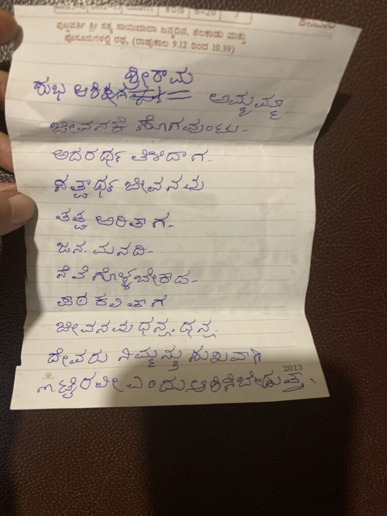 Married in her teens and never having any formal education, she was an astute writer and had a deep interest in literature and writing and spent much of her later years reading and writing. She wrote poems, notes, and reflections. Her writings reflected her experiences, thoughts, and observations about life and society, which my father later published in a book format. Her writings focused on how one should live with dignity, integrity, and purpose. Even in her nineties, she continued to write regularly, and her handwriting remained steady and clear.