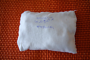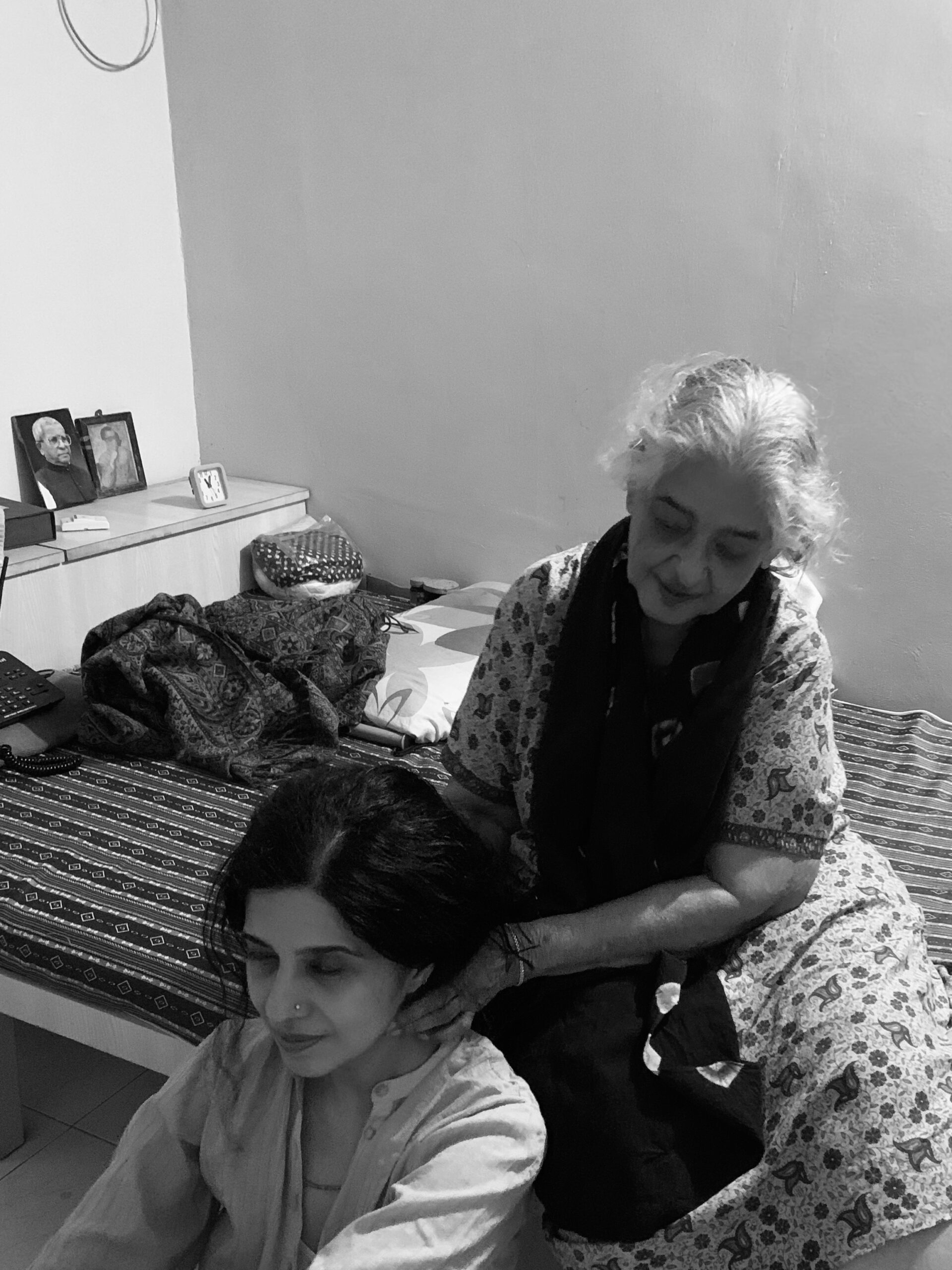 When I was pregnant, she sent me a small cloth bundle filled with herbs that she had carefully prepared and stitched herself, with my name written on it. It was her way of caring for me and my baby even from a distance. When she first came to see my son a few days after he was born, he clung to her saree and would not let go. He was just a few days old, and she sat on the bed without moving for a long time so that he would not wake up. I still remember that moment very clearly. Even today, when I see that photograph of him holding on to her saree with both my grandmothers in it, it feels like a moment that connected generations.